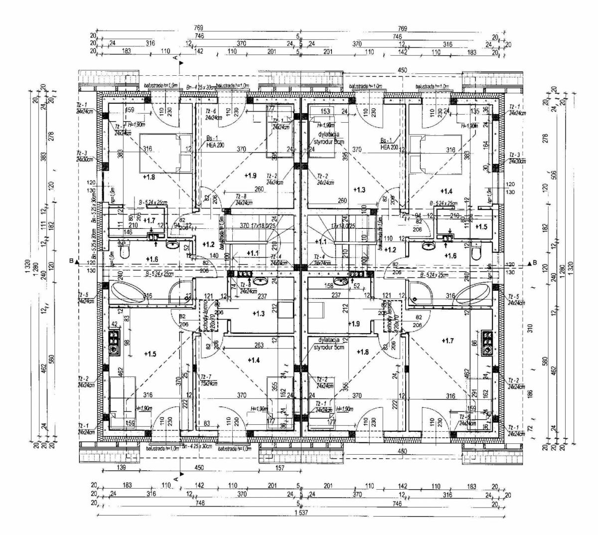 • Stopa fundamentowa żelbetowa, ściany fundamentowe wykończone wieńcem żelbetowym, wszystkie elementy żelbetowe ze zbrojeniem.