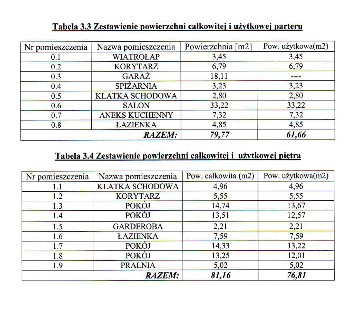 ◦ Piętro (użytkowa: 76,81 m², całkowita: 81,16 m²): cztery pokoje, garderoba, łazienka, pralnia, korytarz.