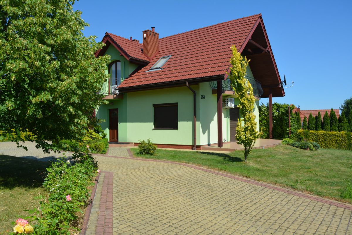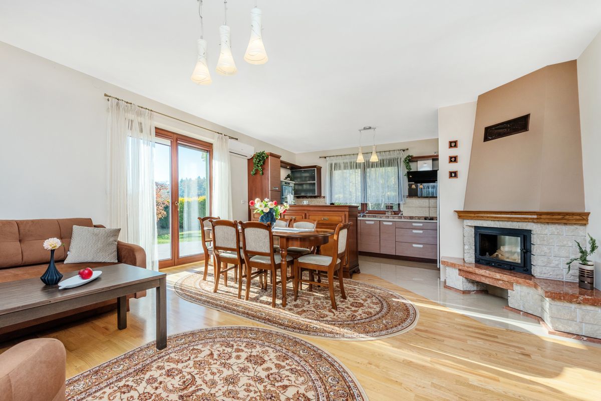 Dom został wybudowany w 2012 roku, ma 112 mkw powierzchni użytkowej, w tym: otwartą przestrzeń z salonem, jadalnią i kuchnią oraz gabinet (sypialnię), łazienkę na parterze (uzupełnione o wiatrołap, pralnię i garaż w bryle budynku), a na piętrze trzy sypialnie, łazienkę i pokój wypoczynkowy nad całym garażem (fitness/gry/itp.). Wyposażony jest w nowoczesny piec gazowy, kominek z nadmuchem we wszystkich pomieszczeniach i instalację centralnego odkurzacza. W pełni wyposażony, bardzo zadbany, gotowy do natychmiastowego zamieszkania. Ilość zalet i trudnych do opisania wrażeń w pewnym zakresie zrekompensuje Państwu załączony film, ale prawdziwą wartość tej oferty będziecie mogli poznać wyłącznie na miejscu.