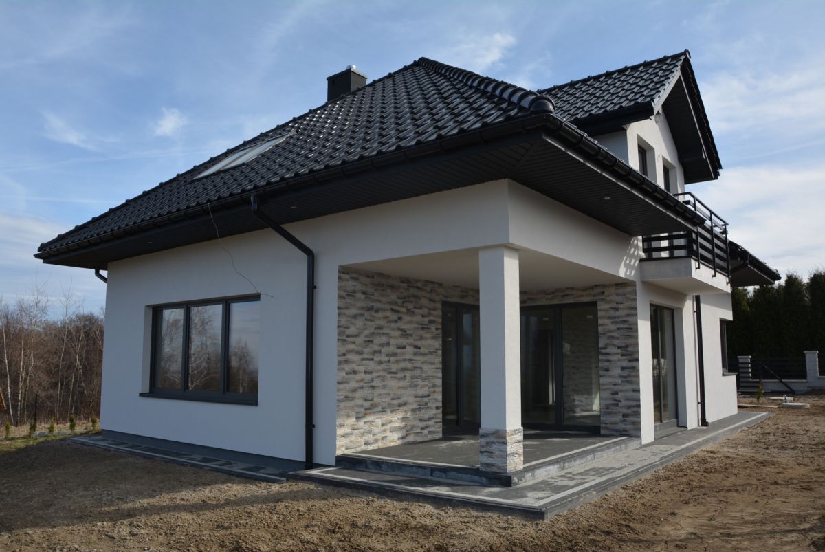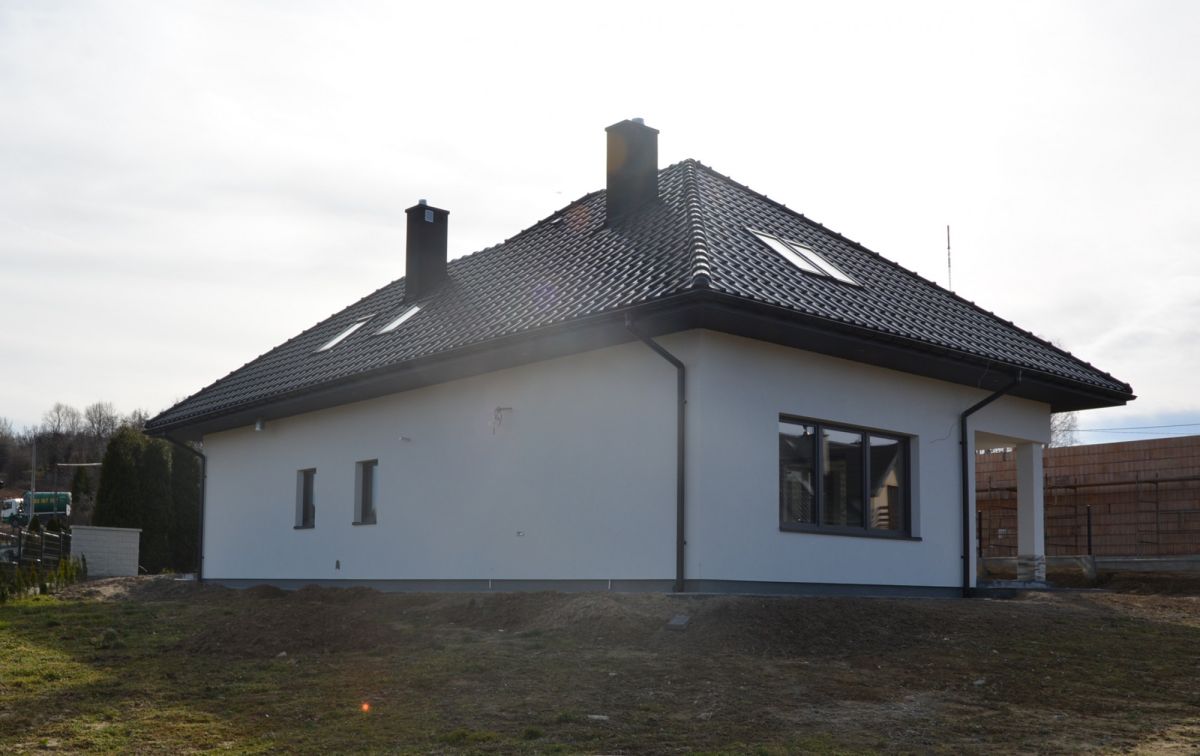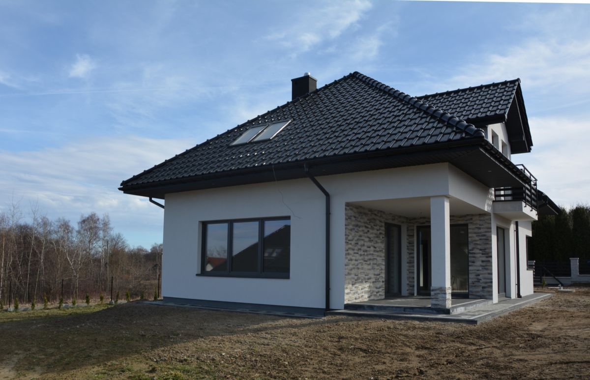 Ściany powstały z pustaka ceramicznego, a dach pokryty dachówką ceramiczną. Dom posiada system kominowy firmy Leier, bramę garażową Novoferm, opaskę i podjazd wykonane z kostki brukowej Polbruk Avanti. Z zewnątrz został ocieplony Styropianem Austrotherm Grafit o grubości 15 cm oraz pokryty tynkiem akrylowym.
