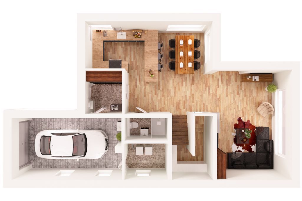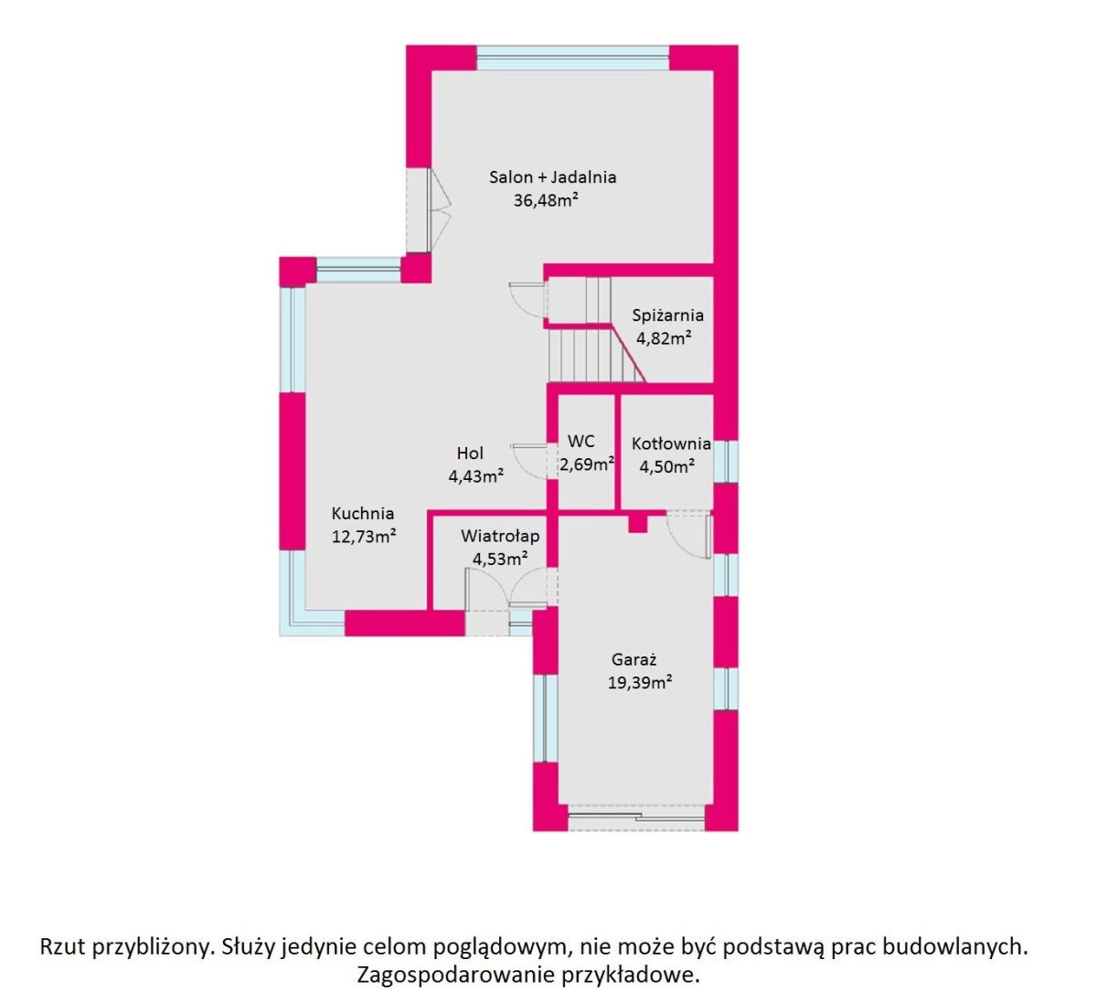 wiatrołap (4,53 mkw), hol (4,43 mkw), kuchnia (12,74 mkw), połączona przestrzeń dzienna czyli salon z jadalnią (36,48 mkw), spiżarnia (4,82 mkw), łazienka (2,69 mkw), kotłownia (4,50 mkw), garaż (19,39 mkw).