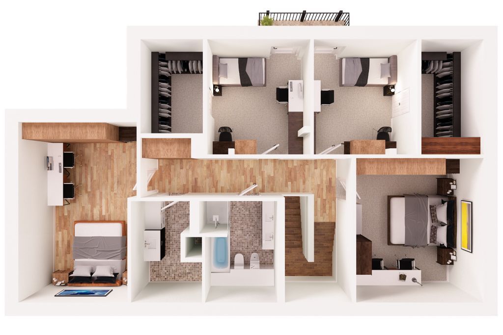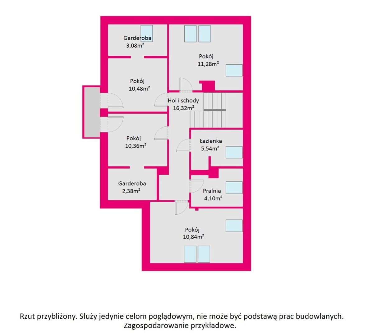 hol (16,32 mkw), sypialnia I (11,28 mkw) z garderobą (3,05 mkw), sypialna II (10,41 mkw), sypialnia III (10,36 mkw) z garderobą (2,38 mkw), gabinet/sypialnia IV (10,84 mkw), pralnia (4,10 mkw), łazienka (5,54 mkw).