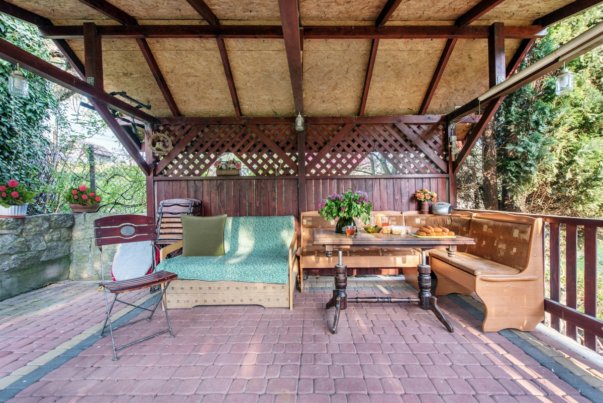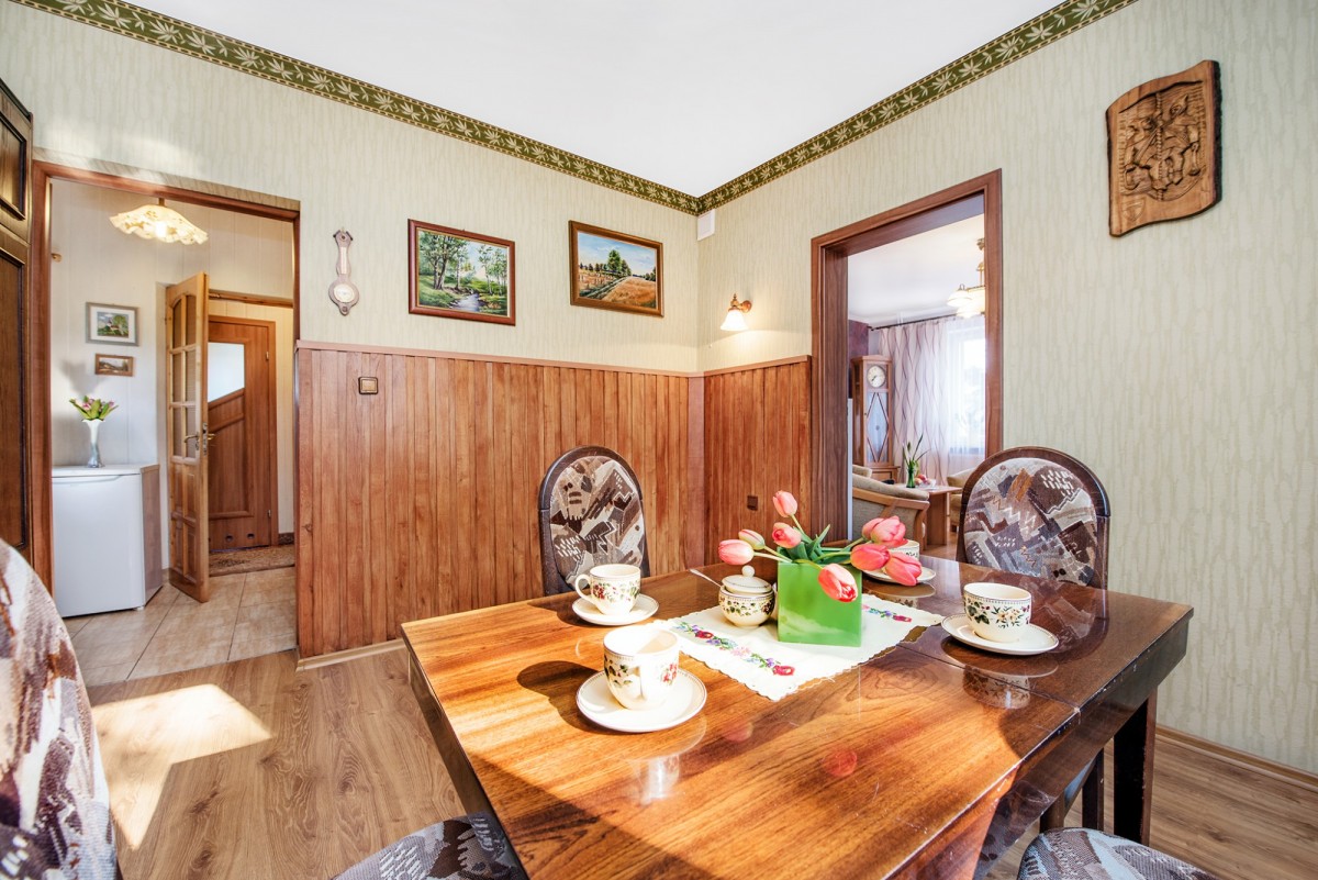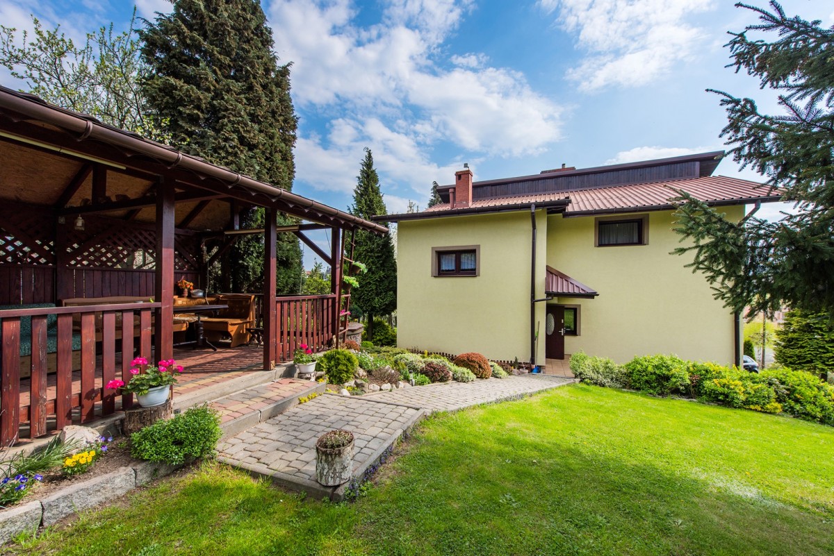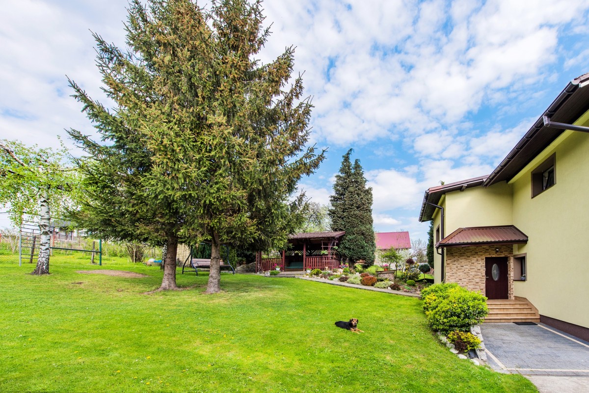 W przyziemiu znajduje się garaż oraz stosunkowo dużo dodatkowych pomieszczeń niezwykle ułatwiających zarówno codzienne życie, jak i przechowywanie większych, sezonowych przedmiotów. Tuz za domem będziecie Państwo dysponować obszerną, klimatyczną altaną idealną na letnie upały. Natomiast przy wjeździe mamy duży budynek gospodarczy z drugim garażem - to również idealne miejsce na warsztat, magazyn, itp.