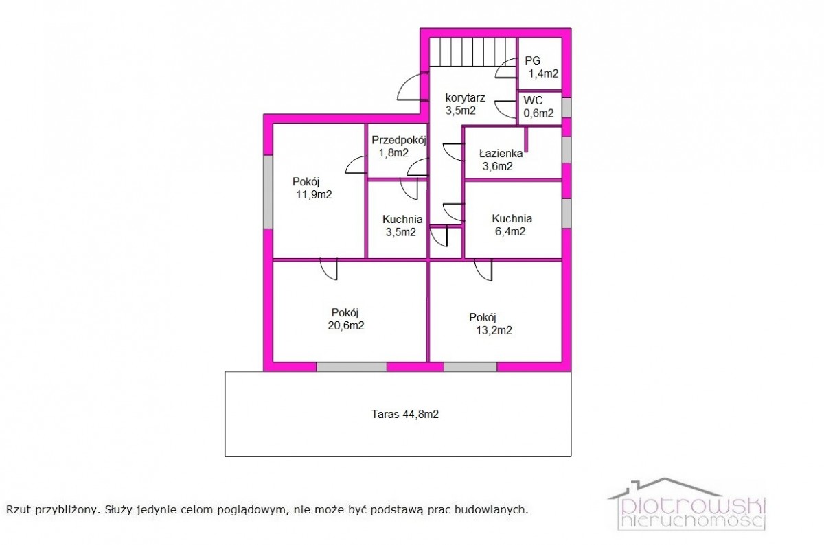 Jego powierzchnia całkowita wynosi prawie 200 mkw, a mieszkalna 146 mkw i składa się z siedmiu pokoi o dowolnym przeznaczenie (sypialnia, jadalnia, gabinet) dwóch kuchni, łazienki i odrębnej toalety. Całość uzupełniają dwa tarasy na obu kondygnacjach - większy na parterze ma 40 mkw!